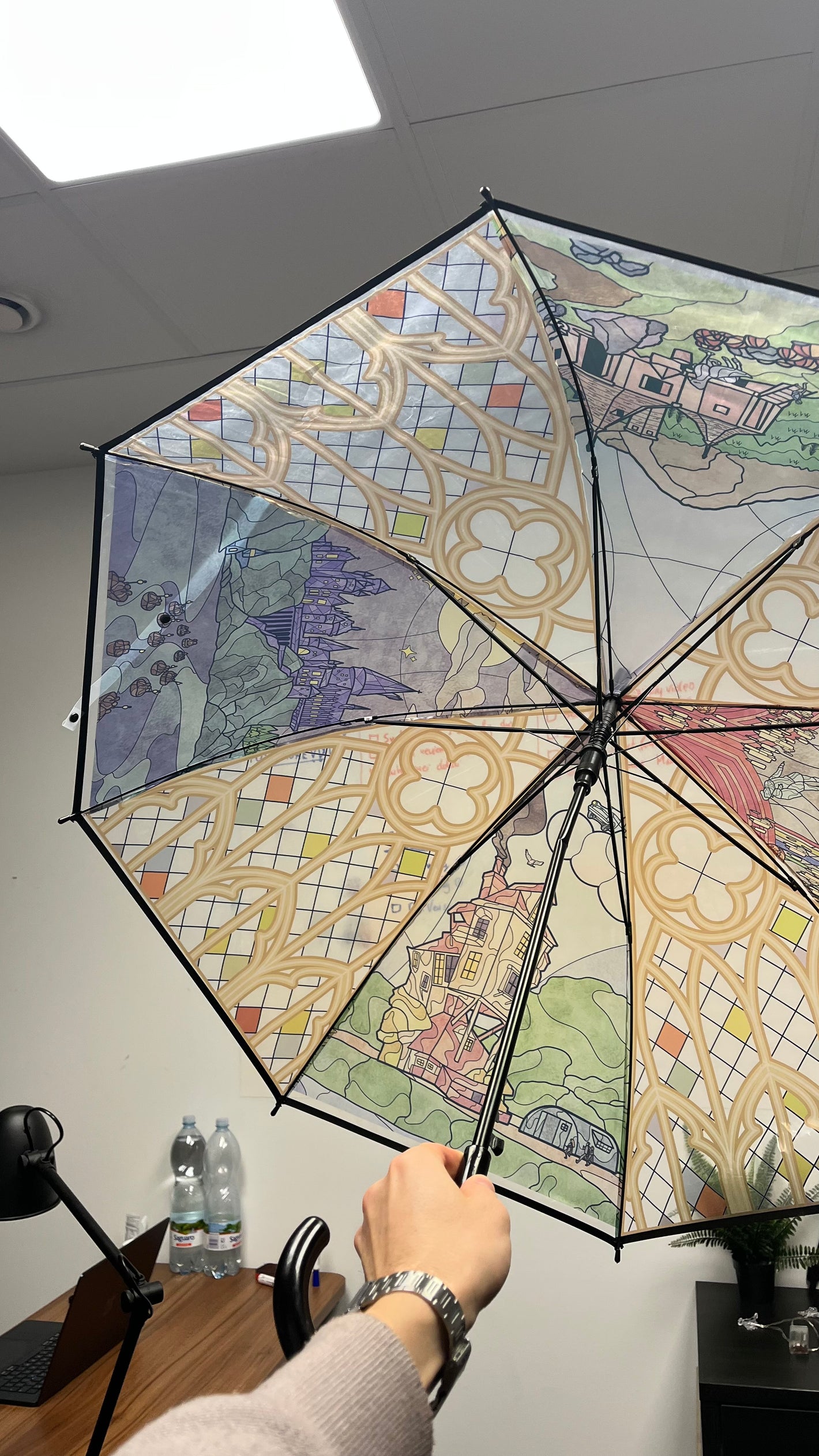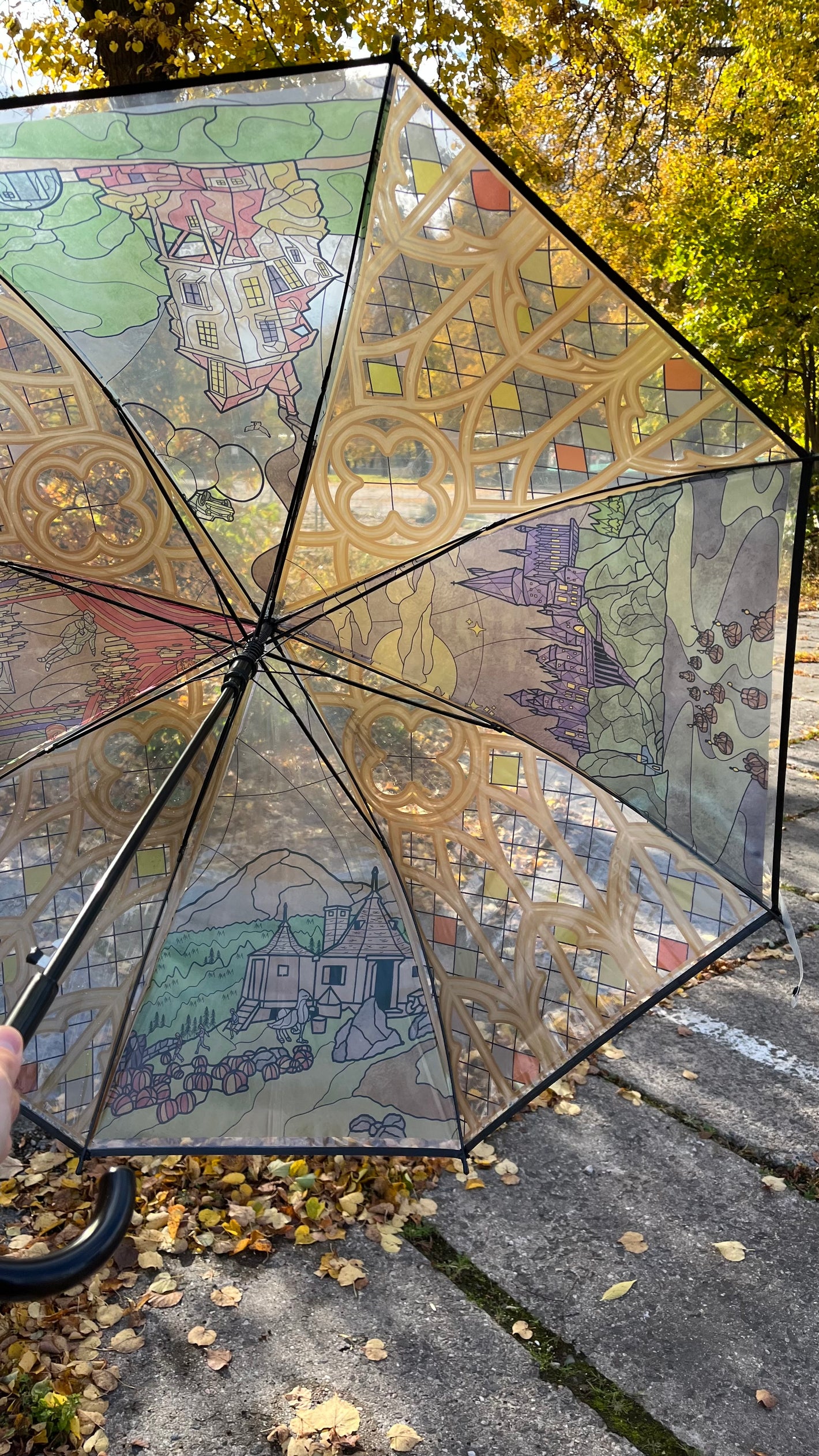 • Umbrella with stained glass design featuring a castle and nature elements.